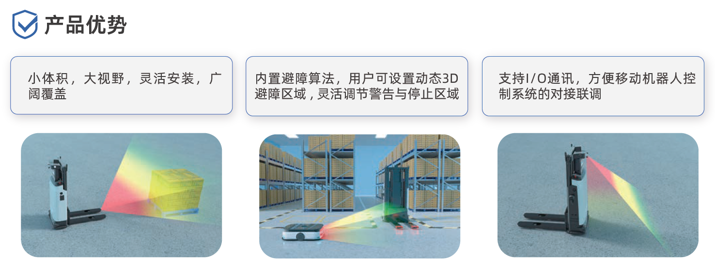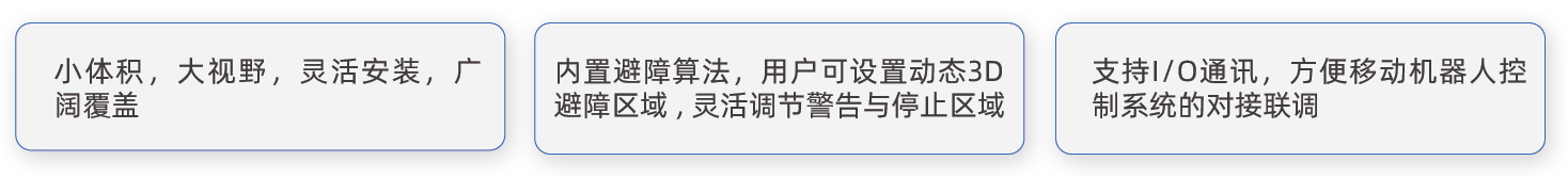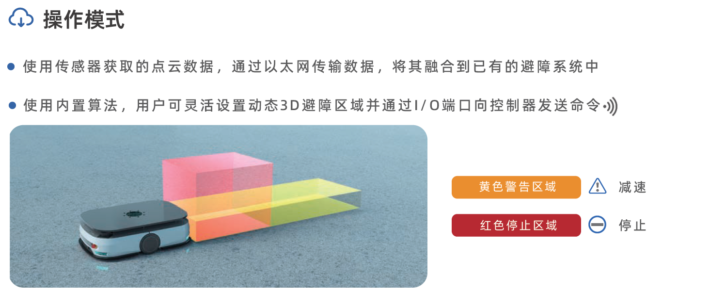 使用內(nèi)置算法,用戶可靈活設(shè)置動態(tài)3D避障區(qū)域,通過I/O端口向控制器發(fā)送命令