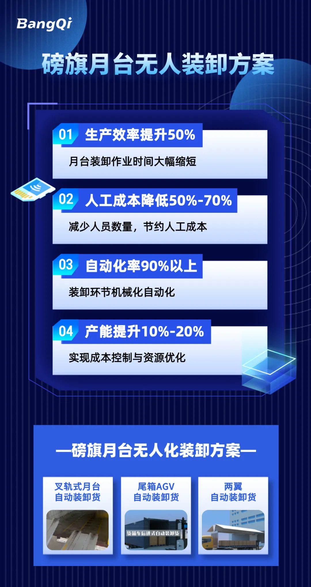 全球智能制造AI無(wú)人工廠數(shù)字化先鋒磅旗科技在助力企業(yè)供應(yīng)鏈管理方面不斷創(chuàng)新優(yōu)化,推出了多種月臺(tái)無(wú)人化裝卸貨解決方案,為客戶提供高效、靈活的自動(dòng)裝卸貨系統(tǒng),賦能新能源、汽車汽配、化工等行業(yè)實(shí)現(xiàn)月臺(tái)作業(yè)數(shù)字化升級(jí),降本增效成果顯著。
