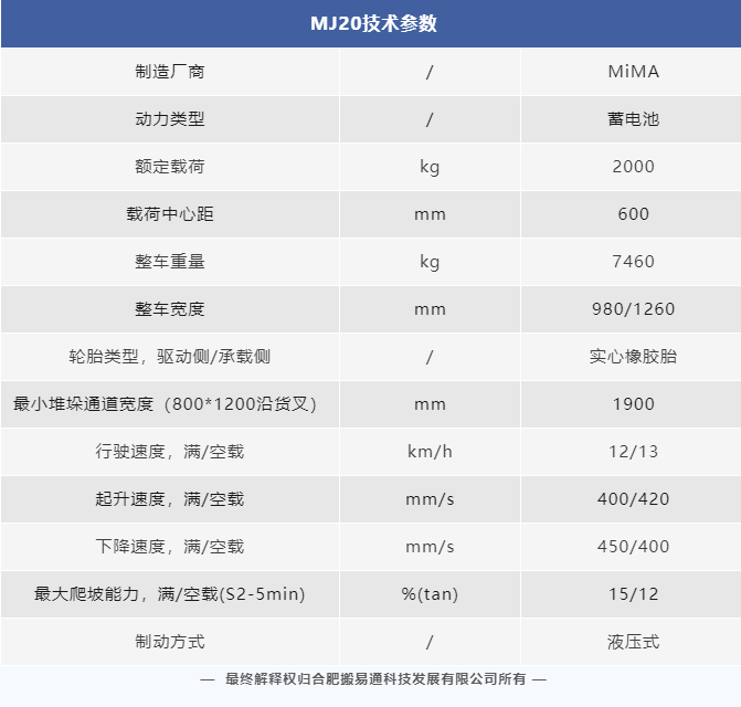 MiMA米瑪MJ20配備了上升限位、自動(dòng)感知的下降限速及下降緩沖功能,這些功能能夠有效保障作業(yè)安全,防止貨物及托盤因沖擊地面而受損,同時(shí)起到保護(hù)貨物和地面的作用。