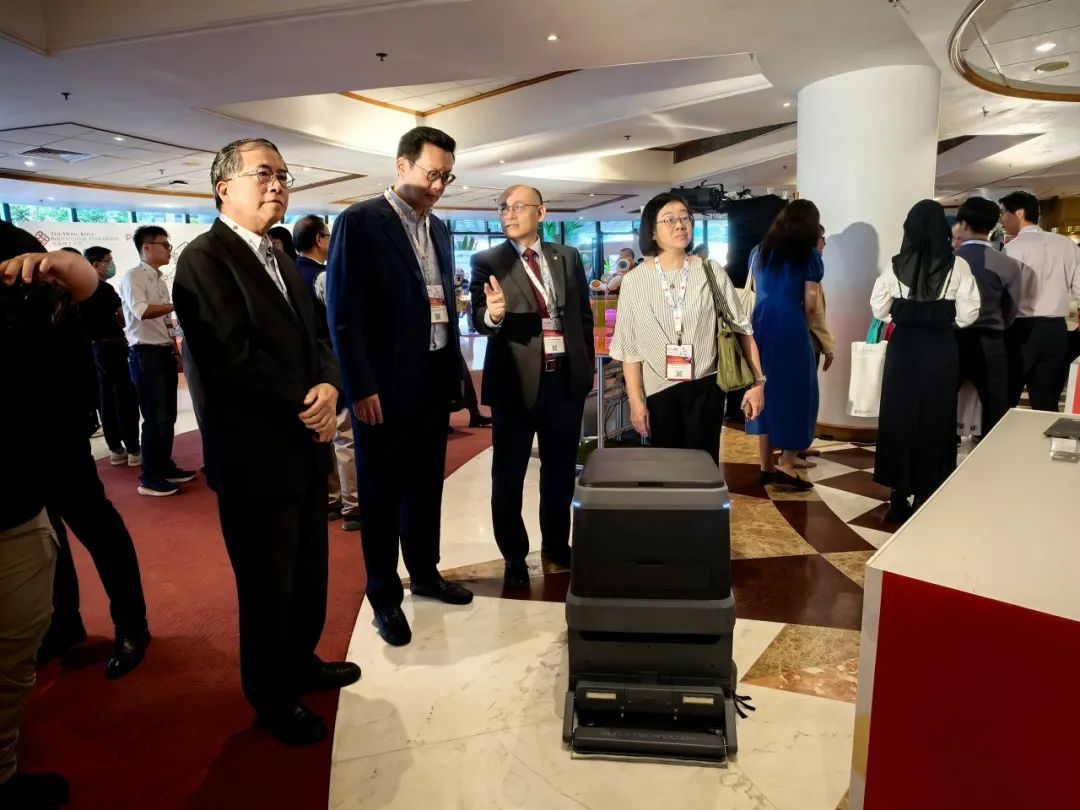 香港理工大學(xué)酒店及旅游業(yè)管理學(xué)院副院長(zhǎng)宋海巖教授(右2)與嘉賓討論復(fù)合多態(tài)機(jī)器人「UP」的價(jià)值
