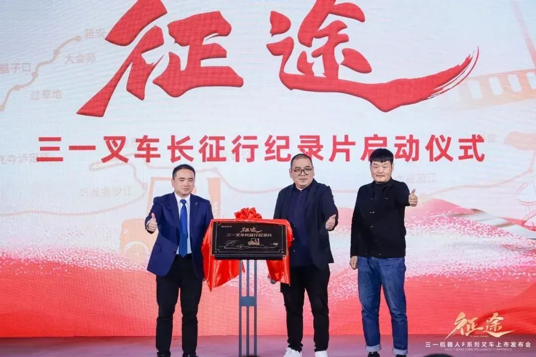 三一叉車(chē)長(zhǎng)征紀(jì)錄片《征途》創(chuàng)意發(fā)起人,三一機(jī)器人董事長(zhǎng)徐鵬飛與石堅(jiān)、黃金兩位導(dǎo)演為《征途》紀(jì)錄片開(kāi)機(jī)儀式揭幕