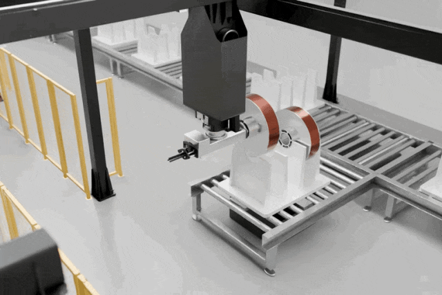 針對傳統(tǒng)搬運設備的痛點,磅旗科技自動OHT系統(tǒng)采用先進的齒輪齒條結構,由齒輪齒條、導軌、伺服電機及視覺識別系統(tǒng)等組成。該系統(tǒng)能夠快速自動地將極卷或隔膜從緩存架取料并對接機臺,實現(xiàn)上下料操作。通過引入視覺定位系統(tǒng),OHT系統(tǒng)能夠實現(xiàn)快速自動對位,相較于傳統(tǒng)設備減少了人工對接時間,大幅提高對接精度。
