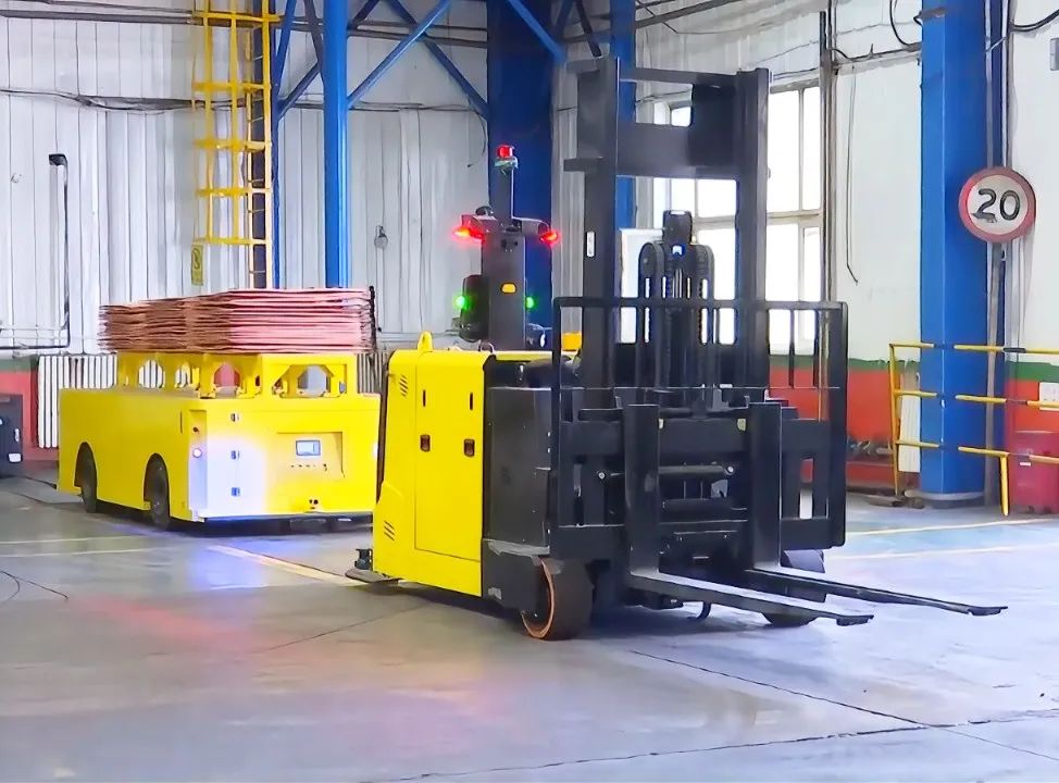 歷經一年精心籌備,投資408萬元的 AGV 電銅自動轉運系統(tǒng)于9月初試運行,系統(tǒng)包含兩臺轉運AGV小車和一臺AGV叉車,是自動化系統(tǒng)中的關鍵一環(huán)。轉運AGV小車采用四驅電機驅動,設計承載能力為10噸,動力強勁、行動靈活,在磁條的導引下,它們能出色地完成電銅從電解車間到成品庫的轉運任務。這種轉變帶來諸多優(yōu)勢:節(jié)省了人力,過去該項作業(yè)需要兩臺叉車和六名叉車司機三班倒作業(yè);消除了人工叉車倒運存在的安全隱患;省掉堆放工序,直接在周轉架上對陰極銅進行打包,且24小時連續(xù)生產。