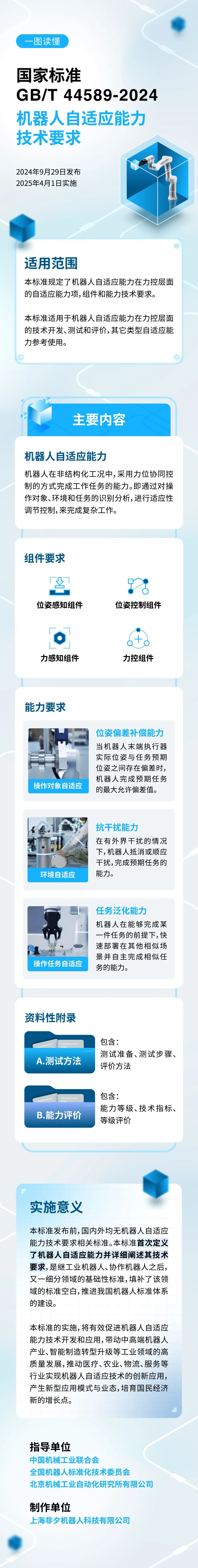 近日,全國機(jī)器人標(biāo)準(zhǔn)化技術(shù)委員會(SAC/TC591) 正式對外發(fā)布了國家標(biāo)準(zhǔn)《機(jī)器人自適應(yīng)能力技術(shù)要求》(GB/T 44589-2024)。該標(biāo)準(zhǔn)規(guī)定了機(jī)器人自適應(yīng)能力在力控層面的自適應(yīng)能力項、組件和能力技術(shù)要求,適用于機(jī)器人自適應(yīng)能力在力控層面的技術(shù)開發(fā)、測試和評價,其它類型自適應(yīng)能力參考使用。