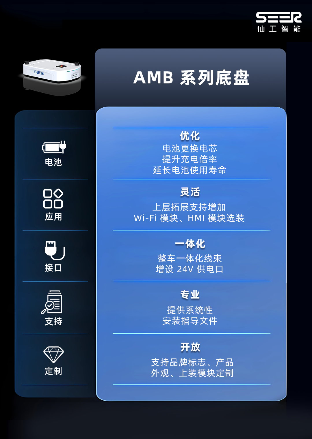 在這種情況下,仙工智能 AMB 系列無人搬運(yùn)底盤無疑是滿足各類非標(biāo)機(jī)器人制造需求的最佳選擇,為具備一定制造和設(shè)計能力的造車客戶提供了一種高效便捷的造車途徑。