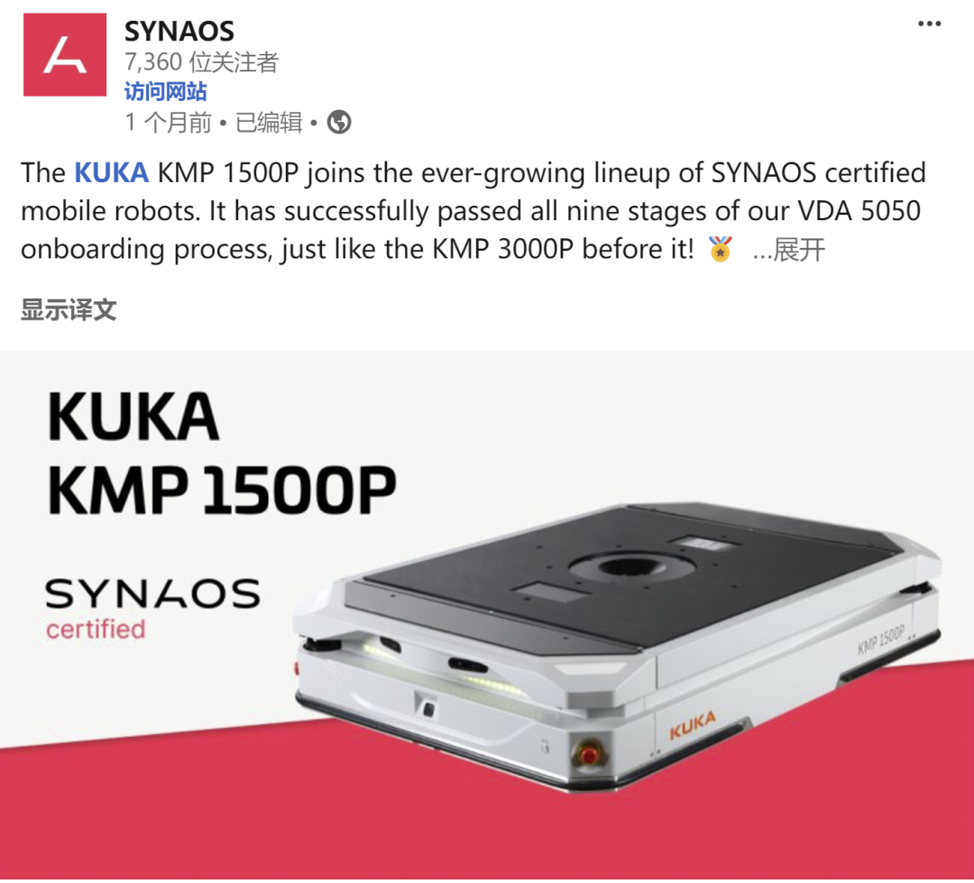 德國(guó)SYNAOS公司為世界著名的工業(yè)物流系統(tǒng)開(kāi)發(fā)集成商。SYNAOS調(diào)度系統(tǒng)采用了現(xiàn)今工業(yè)物流領(lǐng)域主流的VDA 5050 協(xié)議。在SYNAOS公司嚴(yán)格的質(zhì)量要求下,KMP 1500P在實(shí)現(xiàn)了VDA 5050標(biāo)準(zhǔn)協(xié)議的同時(shí),依次通過(guò)了SYNAOS 9步質(zhì)量檢測(cè),達(dá)到了認(rèn)證標(biāo)準(zhǔn),現(xiàn)已成為SYNAOS集成項(xiàng)目中可靠的組成部分,并且可以應(yīng)用到更多行業(yè)領(lǐng)域賦能其內(nèi)部物流升級(jí)。