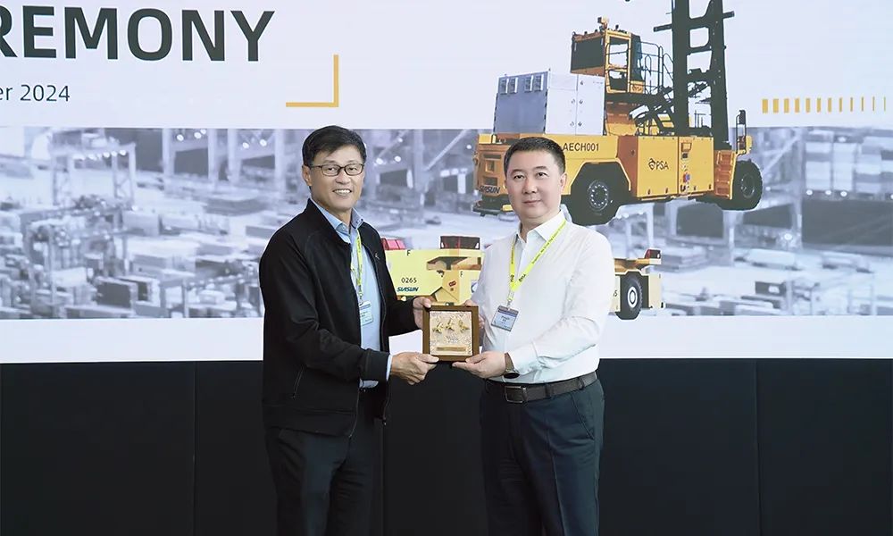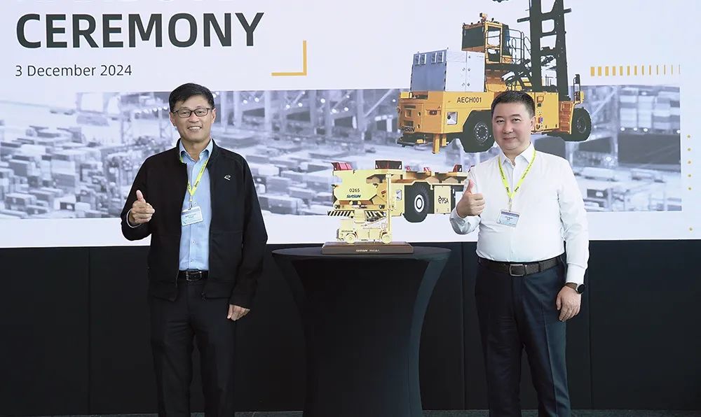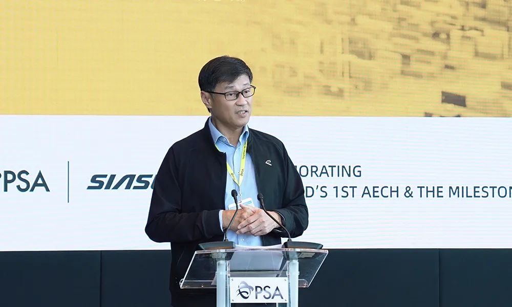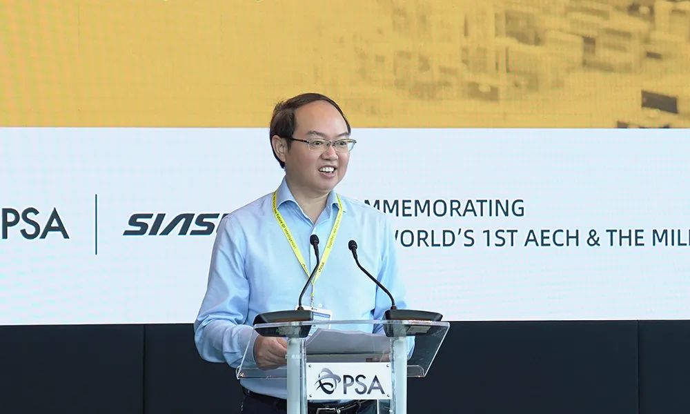 PSA東南亞區(qū)域總裁郭瑞龍為儀式致辭。他表示,多年來,新松公司一直是PSA深度信賴的合作伙伴,他們?yōu)镻SA提供了數(shù)量最龐大的港口移動(dòng)機(jī)器人車隊(duì),并持續(xù)展現(xiàn)出卓越的產(chǎn)品性能。這種高水平的表現(xiàn)不僅彰顯了新松公司的技術(shù)專長,也體現(xiàn)了他們對(duì)致力打造更智能、更可持續(xù)的港口運(yùn)營模式這一共同愿景的承諾。同時(shí)新松公司開發(fā)的全球首臺(tái)AECH,也將在大士碼頭投入使用。未來,我們將共同突破界限,釋放潛在的協(xié)同效應(yīng),期待雙方取得更大成功,也祝愿新松公司:新葉鋪展美好路,松柏常青千秋壽!