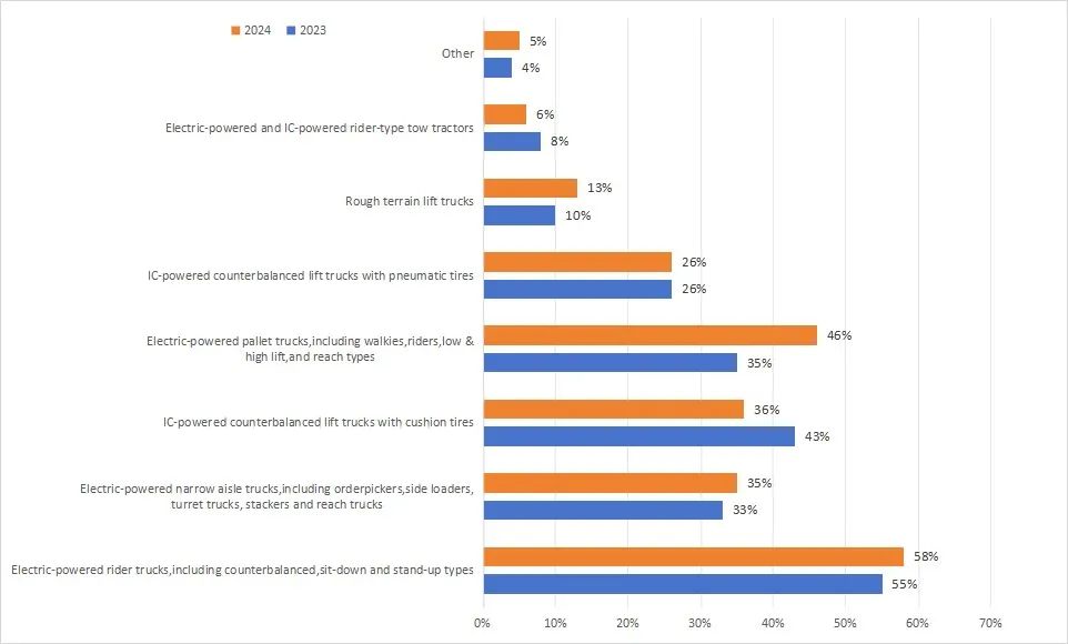 同時(shí),隨著傳統(tǒng)叉車的應(yīng)用面對(duì)多樣化場(chǎng)景挑戰(zhàn),一股創(chuàng)新技術(shù)的浪潮正悄然興起。其中,窄巷道托盤搬運(yùn)機(jī)器人以其獨(dú)特優(yōu)勢(shì),正逐步成為解決這一難題的新銳力量。報(bào)告顯示:35%的受訪者正使用電動(dòng)窄巷道叉車,對(duì)比往年數(shù)據(jù)有所提升,窄巷道搬運(yùn)逐漸熱門。