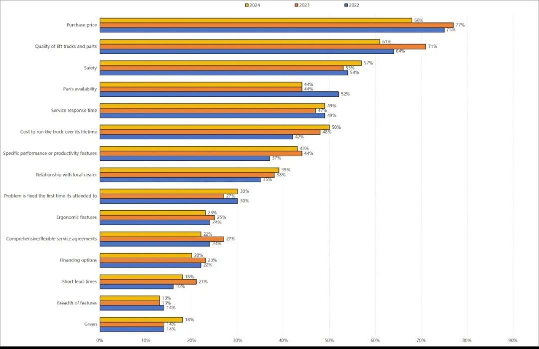 步入2024年,Peerless研究集團(tuán)針對(duì)各類叉車使用情況的最新調(diào)查報(bào)告揭示了買家決策的新動(dòng)向:在選購(gòu)時(shí),企業(yè)首先考慮的是購(gòu)買或租賃的價(jià)格,但將價(jià)格放在首位的受訪者人數(shù)降至 68%(2023 年為 77%)。在價(jià)格因素之外,設(shè)備的功能和服務(wù)已然成為影響購(gòu)買決策的關(guān)鍵考量。