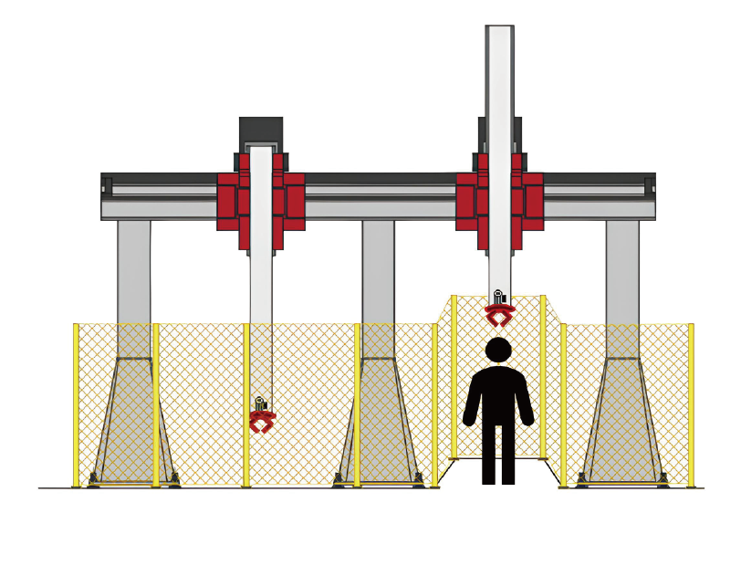 以物料搬運的X-Z龍門機器人為例,操作人員有時需要接近機械手以進行工具更換、維護或清潔。為防止機械臂意外撞擊,需采取安全措施。這需要雙安全制動抱閘,安全轉(zhuǎn)矩關閉 (STO) 激活或斷電時,安全制動控制 (SBC) 負責軸定位。驅(qū)動器維護時若需運行,安全操作停止 (SOS) 不可或缺。當遇Z軸異動時則觸發(fā)STO,繼而激活SBC。