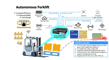 Vecow 嵌入式計(jì)算機(jī)采用最新的 Intel Core i9/i7/i5/i3 處理器,非常適合無(wú)人駕駛叉車應(yīng)用。