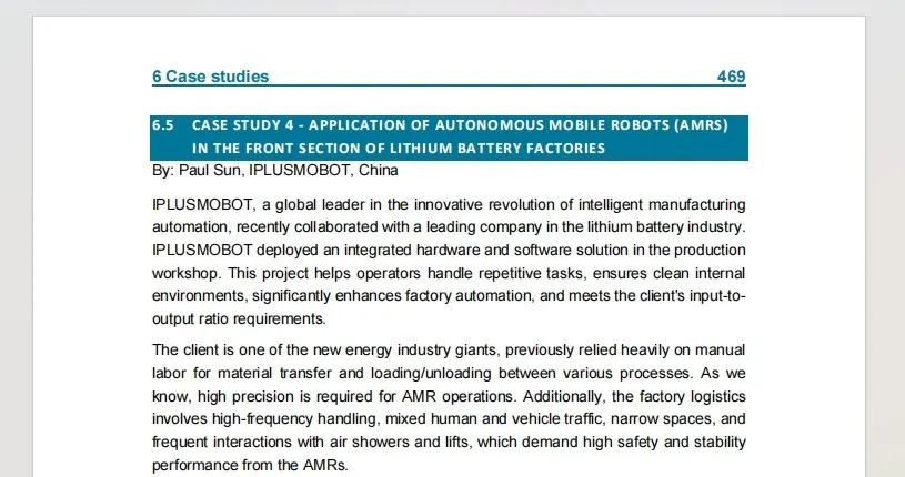 日前,機器人行業(yè)權威機構——國際機器人聯(lián)合會(International Federation of Robotics,簡稱IFR)發(fā)布了最新的《2024世界機器人報告》(以下簡稱“《報告》”)。迦智科技在新能源鋰電池智造工廠的物流智能化轉型升級應用,被納入《報告》典型案例研究。