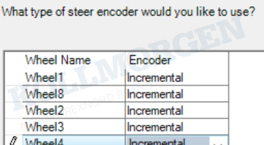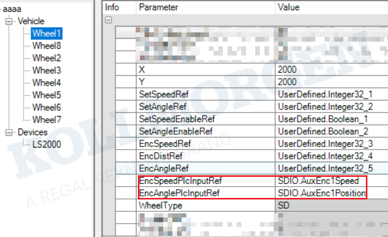 然后,將1/4/5/8(轉(zhuǎn)向+行走)輪的EncSpeedPlcInputRef設(shè)置為SDIO.AuxEnc1Speed,將所有輪的轉(zhuǎn)向EncAnglePlcInputRef設(shè)置為SDIO.AuxEnc1Position。