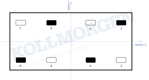 例如,圖示為一個8輪重載全向車型,其中1/4/5/8為轉(zhuǎn)向+行走輪,2/3/6/7為轉(zhuǎn)向輪。