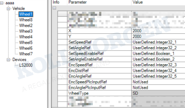 3、至此,我們便完成了8舵輪輪系的全部配置工作。此時,您只需要將參數(shù)Vehicle.SimulationMode設(shè)置為1,再下載到CVC700控制器,即可驗證這臺8舵輪車的運行性能。