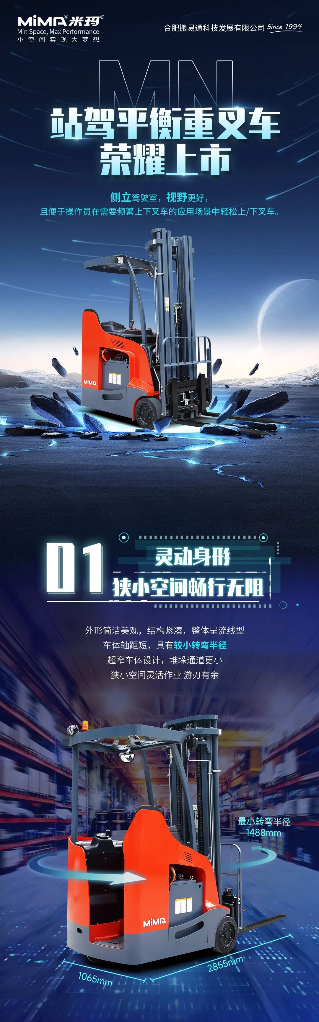 二十多年不斷進(jìn)取, MIMA 品牌以公司強(qiáng)大的科研創(chuàng)新團(tuán)隊(duì)為依托,以“安全、耐用、舒適、低碳(環(huán)保)”為設(shè)計(jì)理念,為客戶提供500KG —100000KG應(yīng)用解決方案、倉(cāng)儲(chǔ)設(shè)備及 相關(guān)服務(wù)。 通過(guò)不斷的技術(shù)創(chuàng)新和專利積累,現(xiàn)在我們的產(chǎn)品已涉及12大類50多個(gè)品種,如電動(dòng)托盤車搬運(yùn)車、托盤堆垛車、前移式叉車、平衡重式叉車、牽引拖車、揀選車、窄巷道叉車、四向叉車、側(cè)面叉車和非常物流設(shè)備、AGV、無(wú)人巷道堆垛機(jī)等等。產(chǎn)品廣泛 應(yīng)用于醫(yī)藥、食品、化工、電子、機(jī)械、家具、物流等各個(gè)行業(yè)。