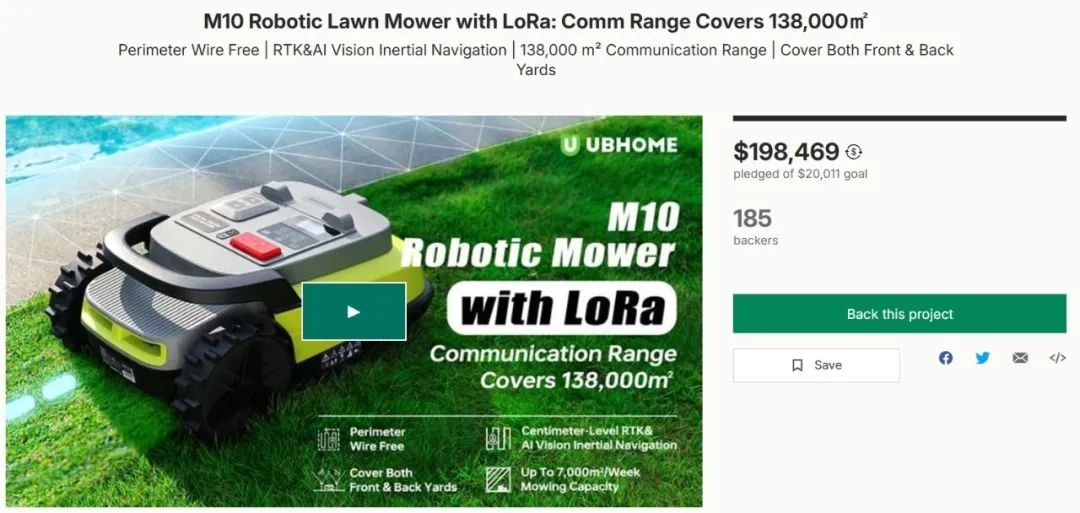 正式亮相前,智能割草機M10已在市場受到廣泛關(guān)注。2024年11月,智能割草機M10正式登陸Kickstarter網(wǎng)站進行海外眾籌并啟動量產(chǎn)。在一個月內(nèi),產(chǎn)品已獲得眾籌金額近20萬美元,眾籌達成率近1000%。目前,這款產(chǎn)品已正式登陸亞馬遜等平臺進行銷售,售價為1799美元。