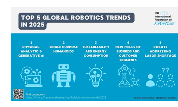 2025 年 1 月 22 日 —全球工業(yè)機(jī)器人安裝市場(chǎng)價(jià)值已達(dá)到 165 億美元的歷史最高水平。未來需求將受到一系列技術(shù)創(chuàng)新、市場(chǎng)力量和新業(yè)務(wù)領(lǐng)域的推動(dòng)。國際機(jī)器人聯(lián)合會(huì)(IFR)發(fā)布 2025 年機(jī)器人行業(yè)的五大趨勢(shì)。