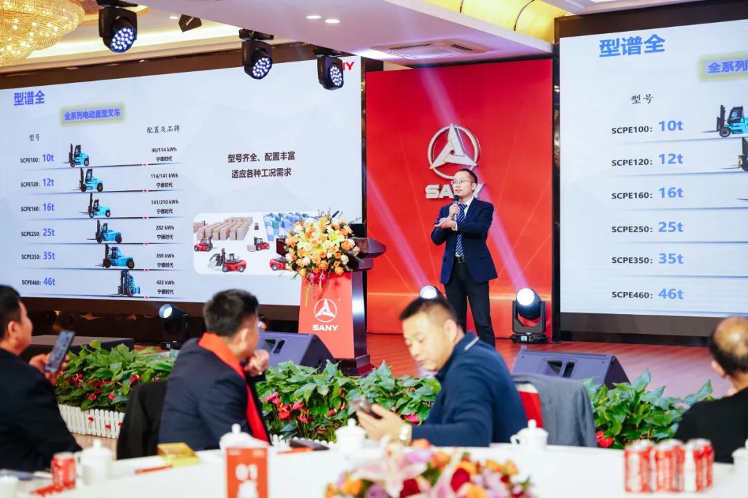 三一海洋重工重叉總體所所長(zhǎng)袁境推介重型叉車產(chǎn)品,目前三一已發(fā)布型譜最全的電動(dòng)叉車系列產(chǎn)品,噸位覆蓋2噸至46噸,全工況全場(chǎng)景均可覆蓋。