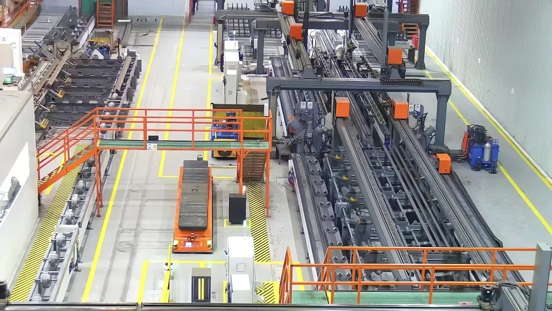 浙江盛達角鋼智能生產(chǎn)車間包含3條自研SD系列角鋼智能無人生產(chǎn)線,可以實現(xiàn)輸電鐵塔全規(guī)格角鋼上下料、打標、切斷、制孔、切角、檢驗、碼垛全流程自動作業(yè),結(jié)合智能倉儲、智慧物流以及智能車間生產(chǎn)管理系統(tǒng),實現(xiàn)車間智能化、數(shù)字化生產(chǎn)。