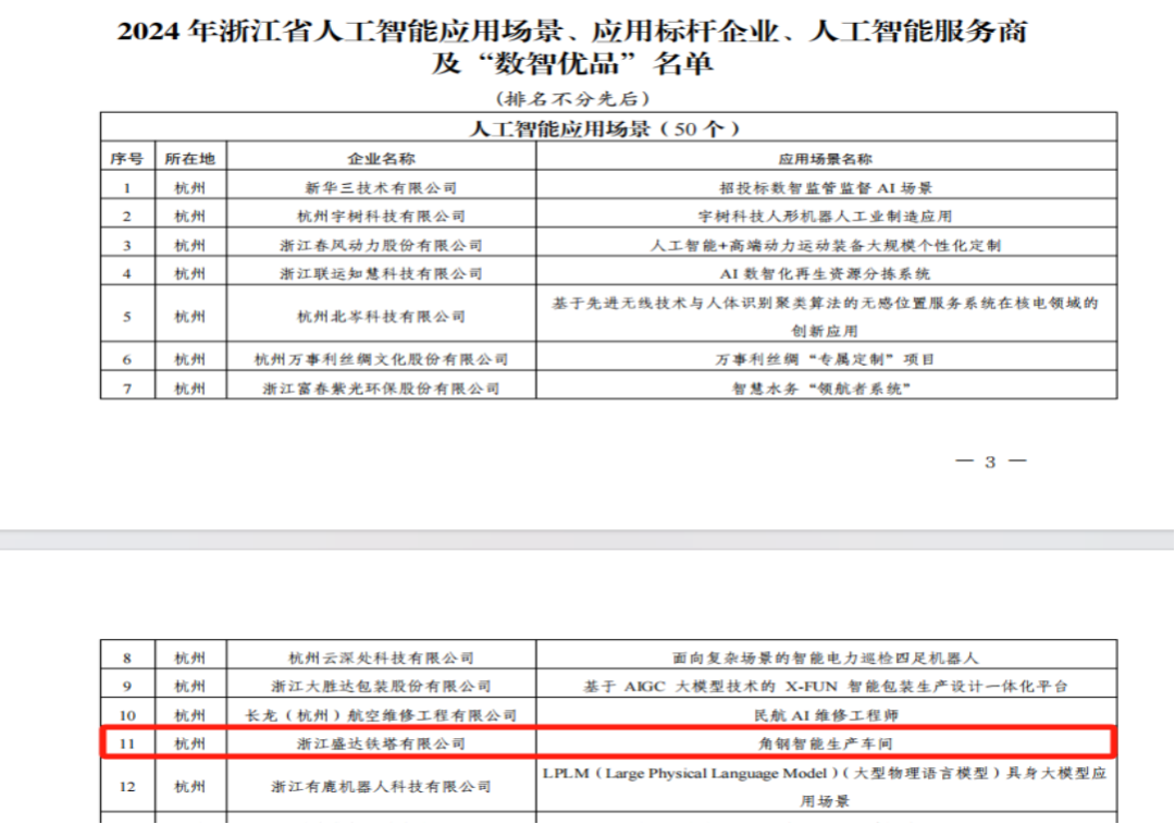 近日,浙江省經(jīng)濟和信息化廳公布了《2024年浙江省人工智能應用場景、應用標桿企業(yè)、人工智能服務商及“數(shù)智優(yōu)品”名單》。山東電工電氣所屬浙江盛達角鋼智能生產(chǎn)車間成功入選2024年度浙江省“人工智能應用場景”。此次入選 ,對浙江盛達來說是一個重要的里程碑,有效提升了企業(yè)品牌形象和市場競爭力。