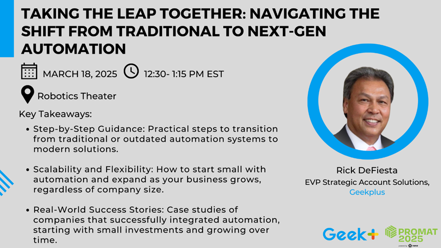 在美國PROMAT展會現(xiàn)場,極智嘉資深專家將為您分享從傳統(tǒng)方案升級到極智嘉機器人方案的成功經(jīng)驗,助您輕松升級您的倉庫自動化系統(tǒng),搶占智慧物流先機!
