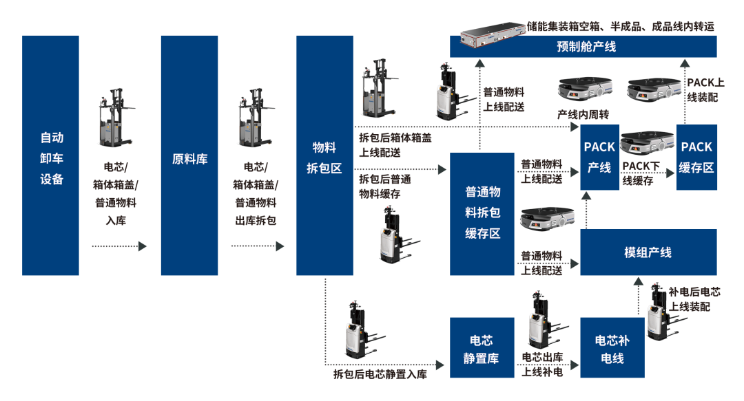 【項目案例】本項目為客戶在美國建立的電池模組和儲能系統(tǒng)組裝工廠。項目共分為線外和線內(nèi)兩部分內(nèi)容,其中線外主要以物料倉儲搬運為主,使用前移式叉車AGV和mini堆垛AGV對接高位貨架,進行托盤物料的出入庫搬運和上線搬運工作;線內(nèi)以潛伏式AGV和重載AGV為主,AGV搬運料車、產(chǎn)品工裝車和成品托架,自動對接產(chǎn)線機臺,進行產(chǎn)線邊物料配送以及產(chǎn)線內(nèi)產(chǎn)品總裝等工作。