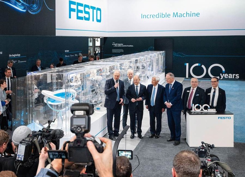 在2025年德國漢諾威工業(yè)博覽會期間,德國總理奧拉夫·朔爾茨(Olaf Scholz)參觀了德國費斯托公司(Festo)的展臺,慶祝該公司成立100周年。朔爾茨總理對Festo的“奇妙機器”(Incredible Machine)展品表示贊賞,稱其為“鼓舞人心的杰作”。
