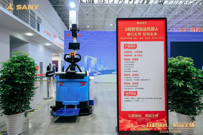 三一機器人攜C7高壓鋰電叉車、2噸智駕搬運機器人兩款新品亮相展示區(qū)。