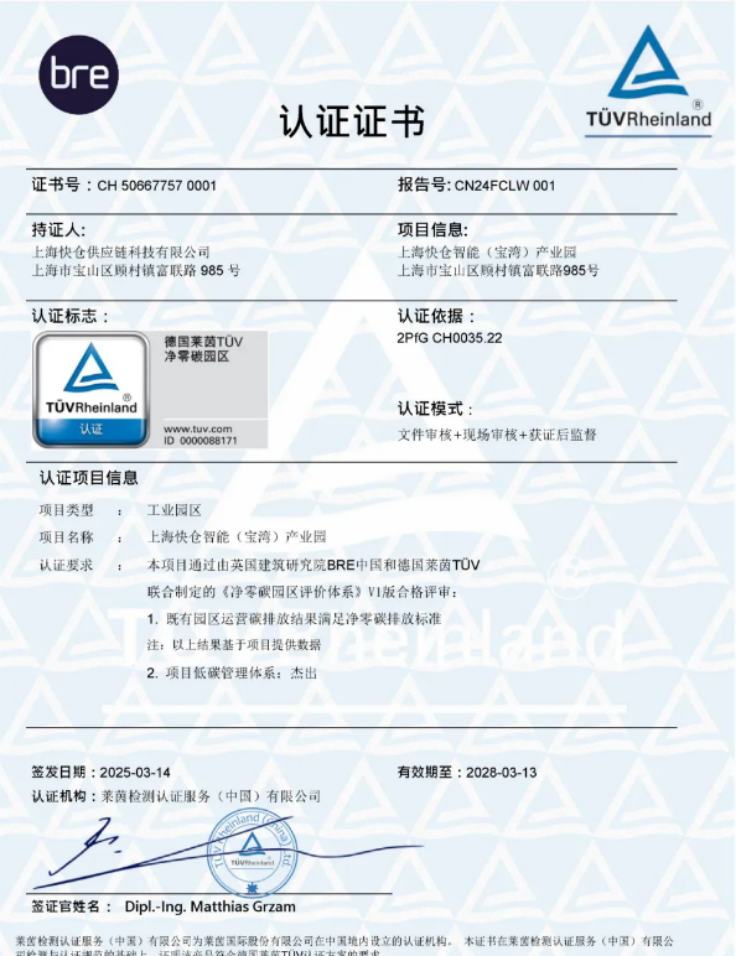 此次獲得的“凈零碳園區(qū)認(rèn)證”已在國(guó)家認(rèn)證認(rèn)可監(jiān)督管理委員會(huì)(CNCA)備案,是國(guó)內(nèi)建筑領(lǐng)域最具先進(jìn)性和權(quán)威性的低碳標(biāo)準(zhǔn)之一,體現(xiàn)了快倉(cāng)在智能制造與綠色發(fā)展的雙重創(chuàng)新能力。