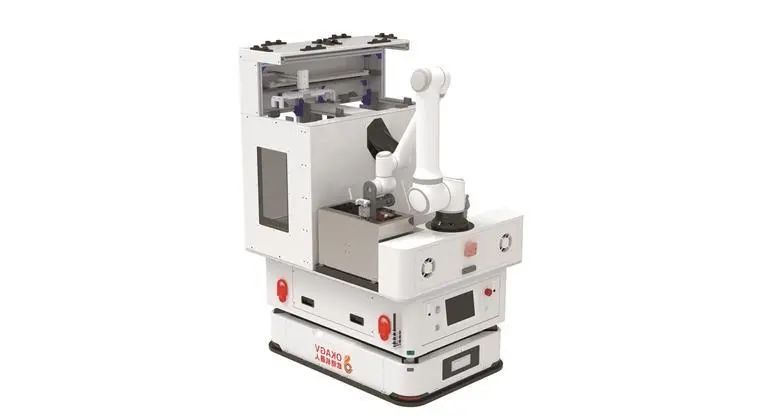 “這是一臺復(fù)合機器人,內(nèi)部空間都被安排得滿滿當(dāng)當(dāng)?!痹跉W鎧機器人車間,研發(fā)人員正在對一臺準(zhǔn)備交付的復(fù)合機器人進行測試,何建忠介紹,復(fù)合機器人就是將AGV+機械手臂兩者成熟的技術(shù)產(chǎn)品相結(jié)合,具備了更精確定位“行走”的功能,其搭載的機械手臂實現(xiàn)了在各種工況下的定制作業(yè),可以和機械臂、3D視覺鏡頭協(xié)作,完成精度要求±0.5毫米以內(nèi)的CNC機臺上下料,一臺復(fù)合機器人可以與26臺CNC自動上下料。再結(jié)合ERP/MES等信息系統(tǒng)指令,復(fù)合機器人與信息系統(tǒng)結(jié)合運作。調(diào)度人員通過系統(tǒng),向復(fù)合機器人下達(dá)物料、上下料的指令,車間智能化也由此形成。