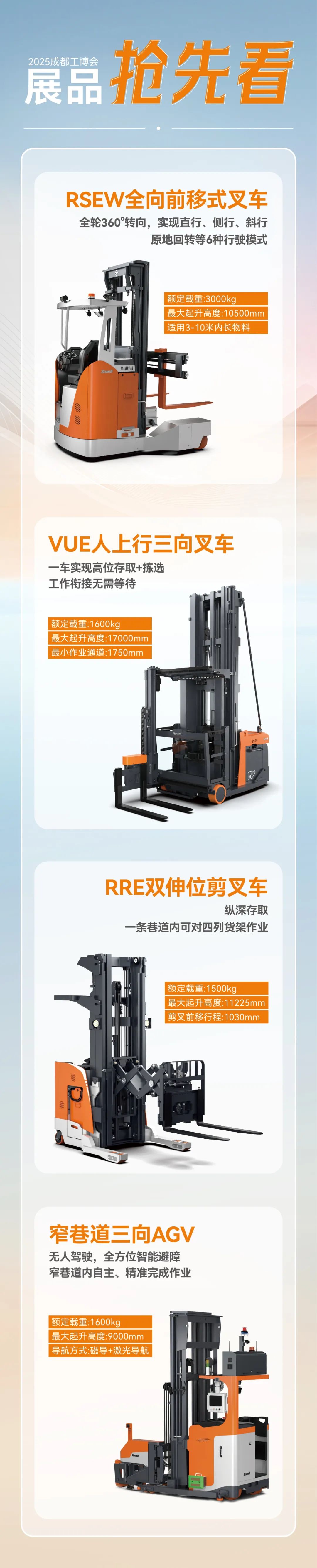 卓一智能叉車將攜窄巷道系列四款產(chǎn)品亮相本次展會(huì),全方位展示不同工況下的窄巷道物流解決方案。