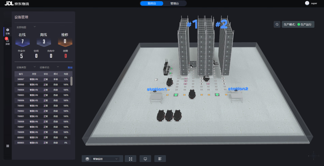 值得一提的是,本次展出的京東物流智狼系統(tǒng)還在軟件層面做了進一步升級。智狼RCS調(diào)度系統(tǒng)采用3D立體可視化監(jiān)控,能夠?qū)崟r掌握設(shè)備的最新狀態(tài),并對設(shè)備進行實時位置與狀態(tài)的采集。當設(shè)備出現(xiàn)異常時,系統(tǒng)能及時發(fā)出異常告警,并幫助用戶快速定位異常設(shè)備所在位置,快速處理異常,實現(xiàn)更加穩(wěn)定的倉儲運營與維護管理。