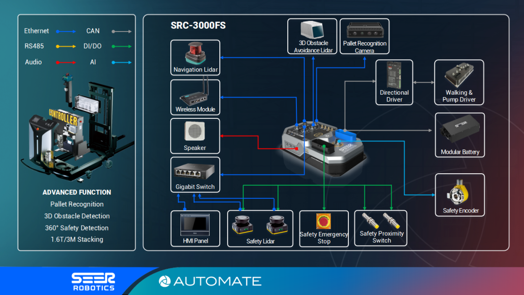展會(huì)現(xiàn)場(chǎng)展示了安全型控制器 SRC-3000FS 及合作伙伴配件庫(kù),包含安全激光、安全編碼器、無(wú)線(xiàn)充電模塊等,所有配件支持即插即用,目前已適配市面上 300+ 品牌配件?,F(xiàn)場(chǎng)屏幕展示 Roboshop 一站式機(jī)器人部署工具,直觀(guān)操作可見(jiàn)機(jī)器人調(diào)試流程。