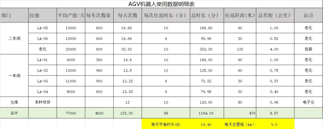 根據(jù)統(tǒng)計(jì)數(shù)據(jù),兩個(gè)車間的7條產(chǎn)線、老化房、來料檢測(cè)區(qū),在使用AMR搬運(yùn)機(jī)器人后,節(jié)省了大量人力在路途上的無(wú)效消耗,每天節(jié)省工作時(shí)長(zhǎng)約19.4小時(shí),總里程達(dá)到9公里,這意味著原本需要大量人力投入的跑腿工作,現(xiàn)在僅通過一鍵呼叫AMR機(jī)器人功能,就能實(shí)現(xiàn)無(wú)人化自動(dòng)搬運(yùn),極大地減少了人力負(fù)擔(dān)。