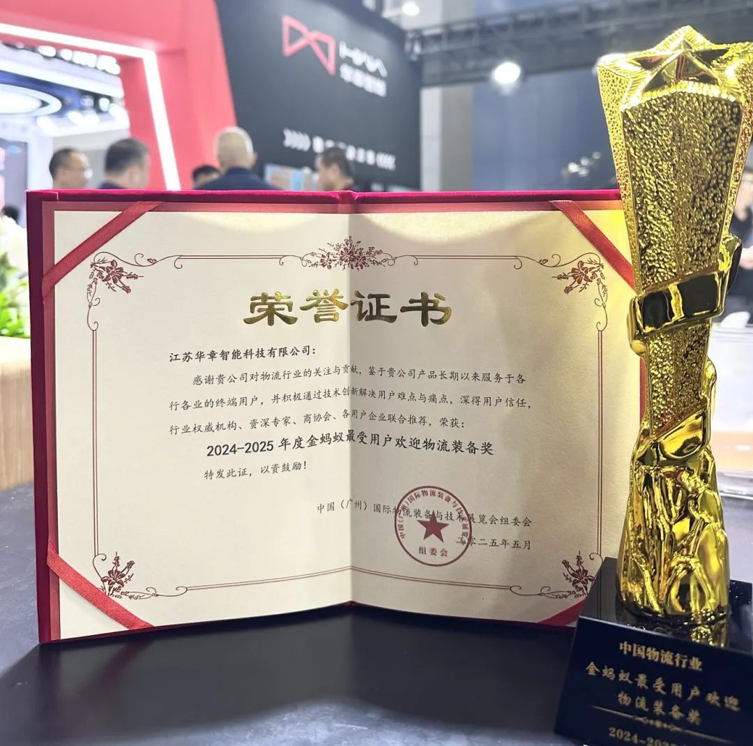 憑借卓越的產(chǎn)品性能和良好的市場(chǎng)口碑,華章智能榮獲了"2024-2025年度金螞蟻?zhàn)钍苡脩魵g迎物流裝備獎(jiǎng)"。
