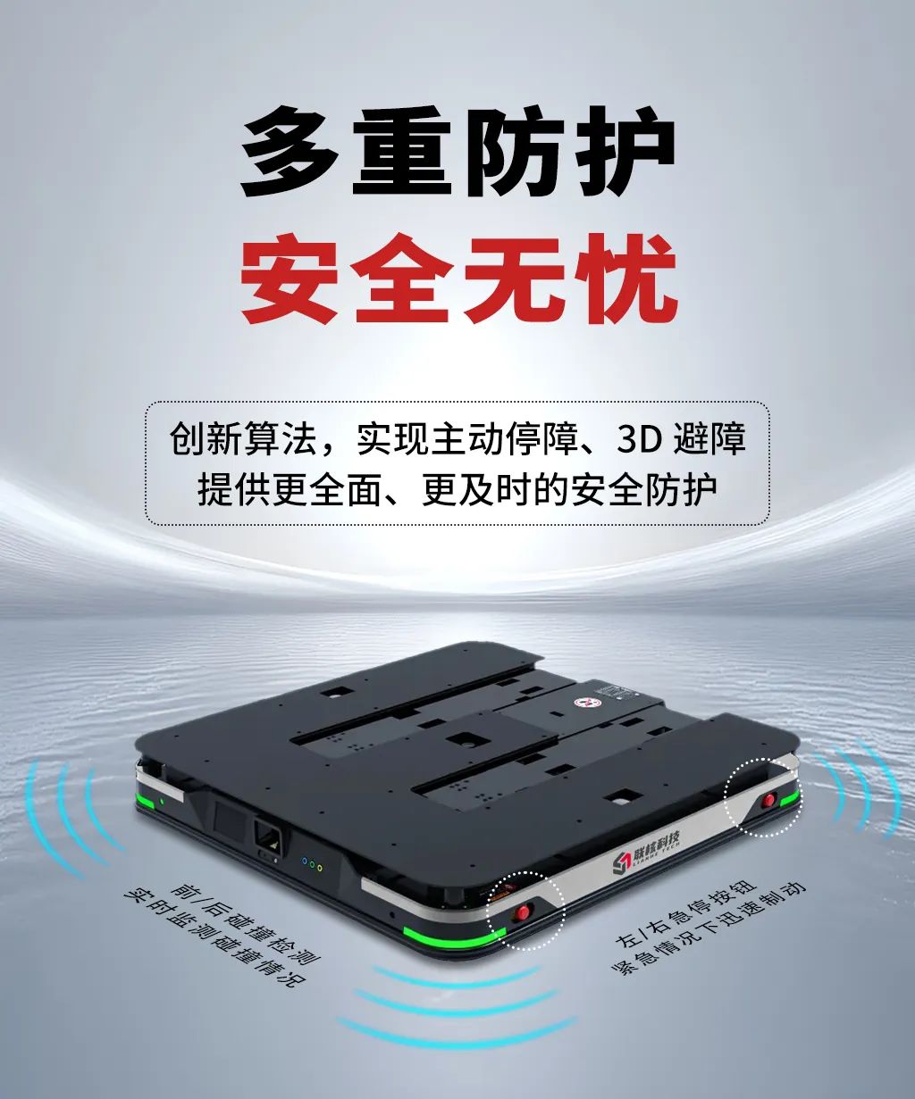 安全是物流作業(yè)的重中之重。聯(lián)核科技LC10 叉取式移動(dòng)機(jī)器人在安全性能方面下足了功夫,配備了多重防護(hù)策略,全方位保障現(xiàn)場(chǎng)人員與貨物的安全。