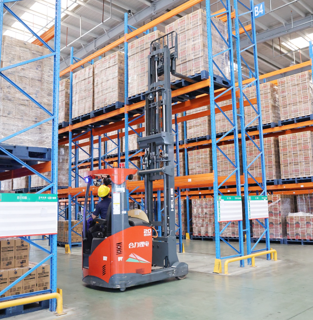 在倉儲(chǔ)區(qū),合力CDD系列AGV與G2系列新能源叉車高效協(xié)同,構(gòu)建起智能化的倉儲(chǔ)搬運(yùn)體系。為滿足不同堆垛需求,合力配置多種車型協(xié)同作業(yè):多臺AGV沿設(shè)定路線自動(dòng)導(dǎo)航,將滿載貨物的托盤精準(zhǔn)投送至指定工位;新能源平衡重叉車負(fù)責(zé)貨物的高位堆垛作業(yè),具備優(yōu)良的轉(zhuǎn)向靈活性和舉升穩(wěn)定性,確保大批量貨物安全高效入庫;而新能源前移式叉車則在窄巷道內(nèi)靈活作業(yè),負(fù)責(zé)高位貨物的精準(zhǔn)存取。