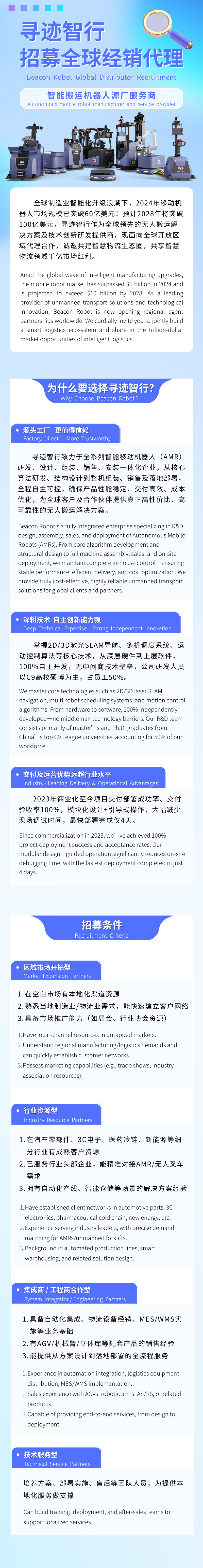 蘇州尋跡智行機器人技術有限公司是一家致力于全系列智能移動搬運機器人AGV/AMR研發(fā)、設計、組裝、銷售、實施部署、售后一體化企業(yè),目前主營產品有:AMR機器人(含背負頂升、回轉、輥筒、皮帶、機械手臂);搬運叉車(含地牛平面搬運、堆垛式、前移舉升式、平衡重式)、以及集群機器人中央控制系統(tǒng)(RMS系統(tǒng)),WMS系統(tǒng),WCS系統(tǒng)等,同時為用戶提供定制化的智能倉儲搬運解決方案。