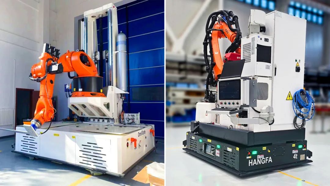 航發(fā)機器人研制的重載復合機器人,可以搭載各品牌多型號的機械臂,可實現(xiàn)上下料、焊接、打磨、制孔、噴漆等多種應用。
