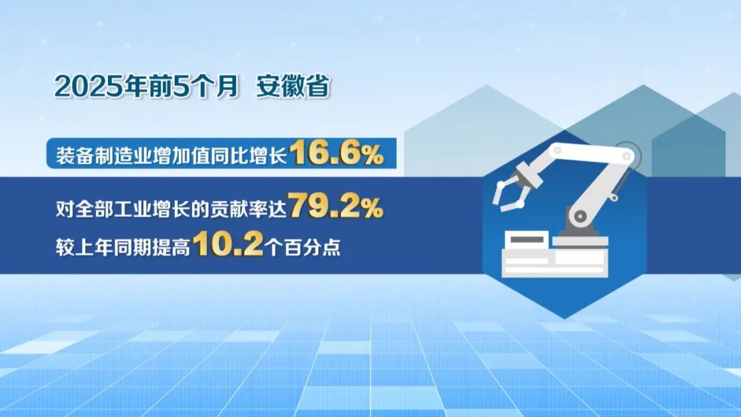 今年前5個月,安徽裝備制造業(yè)增加值同比增長16.6%,對全部工業(yè)增長的貢獻(xiàn)率達(dá)79.2%、較上年同期提高10.2個百分點(diǎn)。