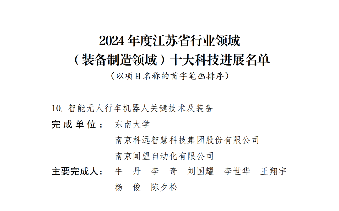 近期,江蘇省科學技術(shù)協(xié)會公布2024年度江蘇省行業(yè)領(lǐng)域十大科技進展。科遠智慧聯(lián)合東南大學、科遠子公司南京聞望自動化完成的“智能無人行車機器人關(guān)鍵技術(shù)及裝備”技術(shù)成果成功入選2024年度江蘇省行業(yè)領(lǐng)域(裝備制造領(lǐng)域)十大科技進展。