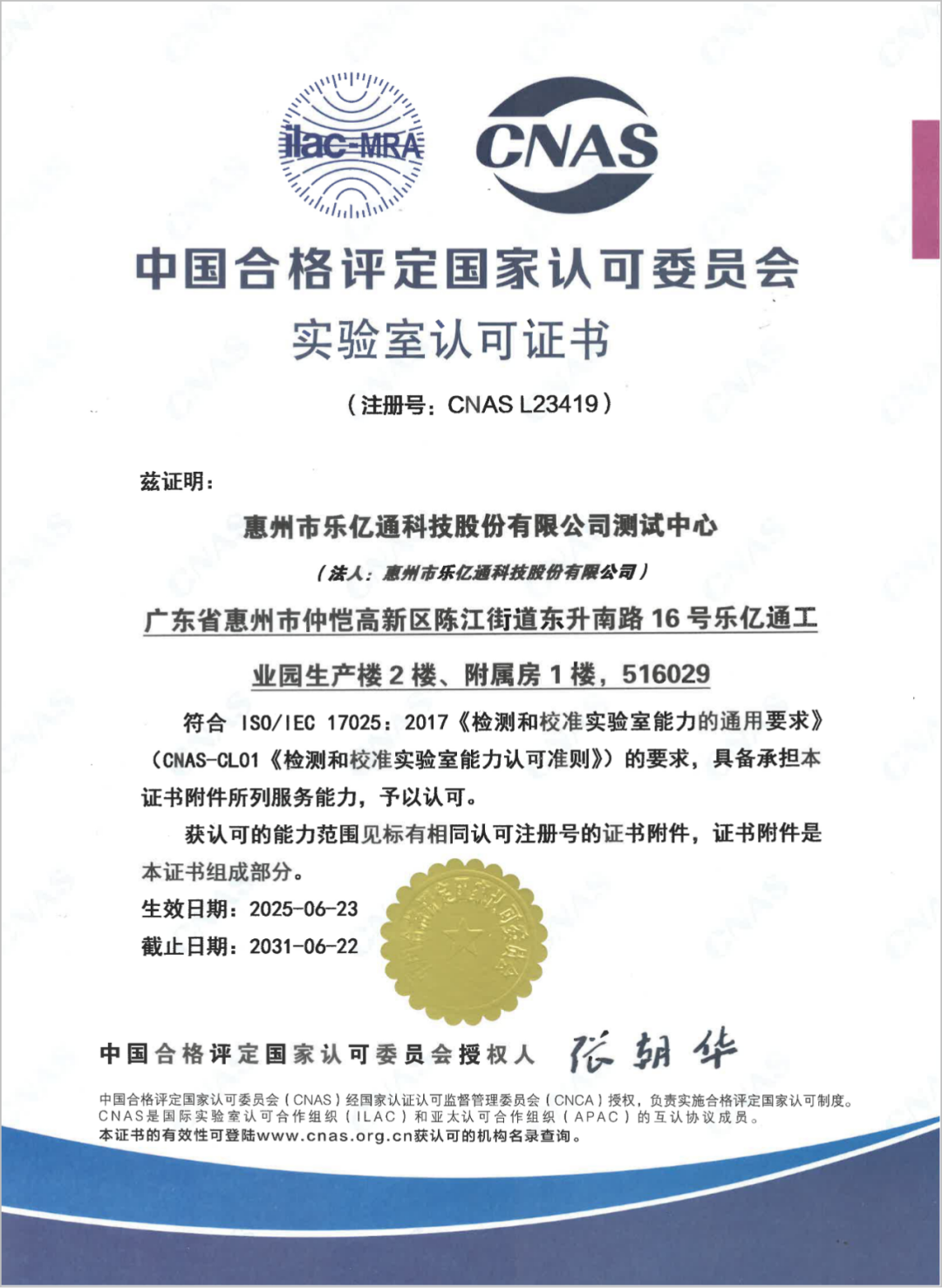 近日,樂億通測試中心成功通過中國合格評定國家認可委員會(CNAS)的嚴(yán)格評審,正式獲得實驗室認可證書(注冊號:CNAS L23419)。