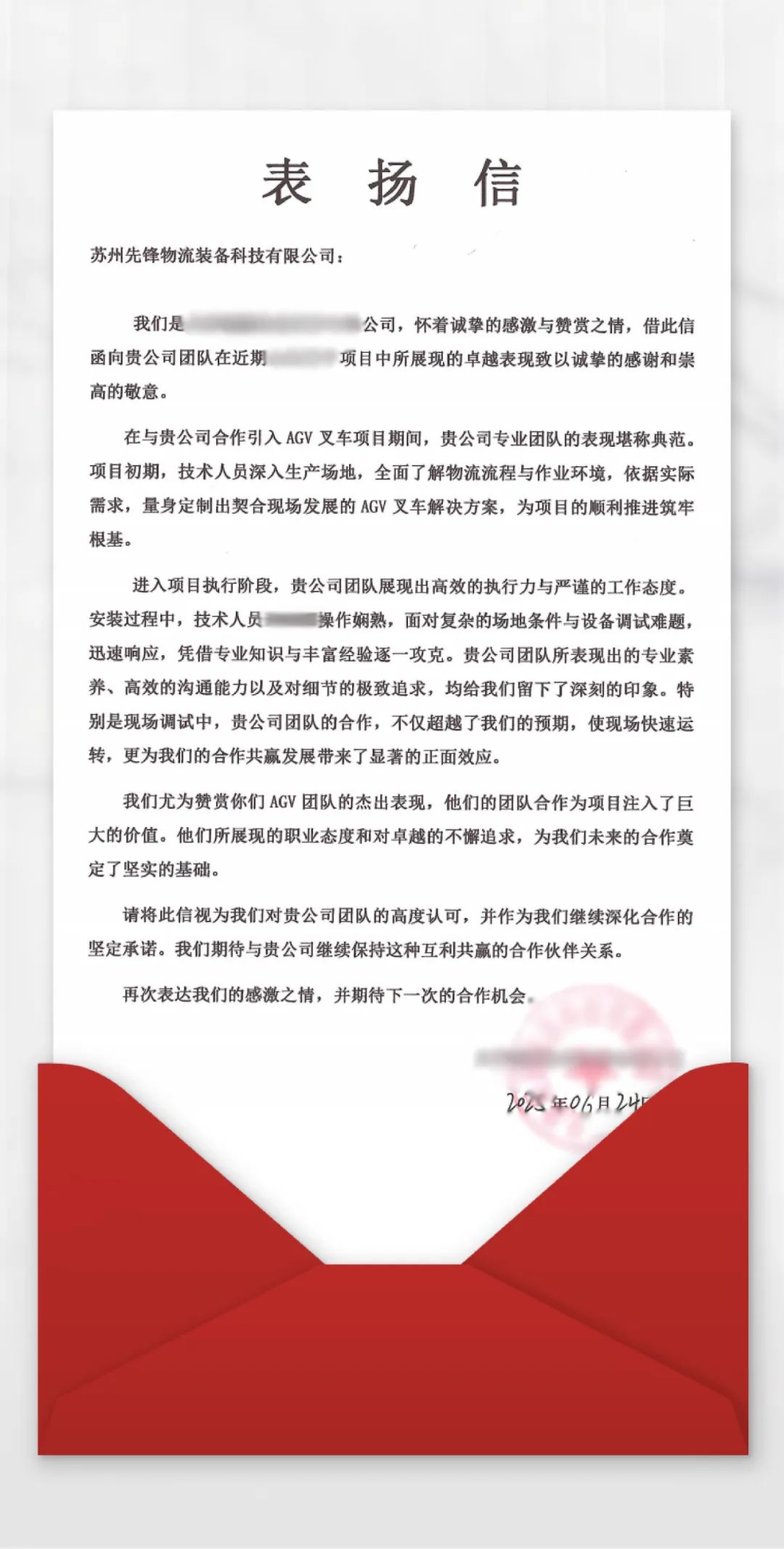 近日,卓一智能叉車收到來(lái)自客戶的表?yè)P(yáng)信,信中對(duì)卓一智能叉車窄巷道AGV項(xiàng)目的成功交付及AGV技術(shù)團(tuán)隊(duì)的嚴(yán)謹(jǐn)高效給予了高度贊賞。這不僅是對(duì)卓一技術(shù)實(shí)力、專業(yè)服務(wù)能力的認(rèn)可,更是對(duì)卓一助力客戶產(chǎn)業(yè)智能化升級(jí)的肯定。