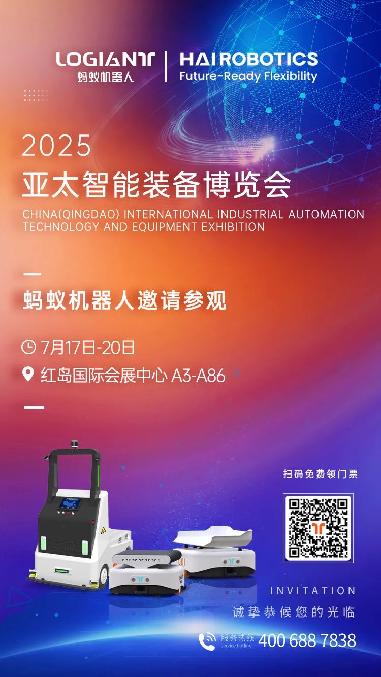 2025年7月17日-20日,螞蟻機(jī)器人將攜 室外園區(qū)搬運(yùn)方案+室內(nèi)三大王炸智慧物流解決方案 實(shí)力亮相2025亞太智能裝備博覽會(huì),誠(chéng)邀各位伙伴蒞臨紅島國(guó)際會(huì)展中心A3-A86,現(xiàn)場(chǎng)體驗(yàn)螞蟻機(jī)器人全場(chǎng)景智慧物流的創(chuàng)新魅力,共話(huà)全球智造發(fā)展新藍(lán)圖!