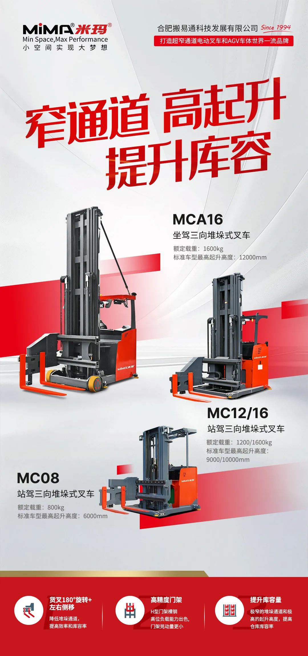 二十多年不斷進(jìn)取, MIMA 品牌以公司強大的科研創(chuàng)新團(tuán)隊為依托,以“安全、耐用、舒適、低碳(環(huán)保)”為設(shè)計理念,為客戶提供500KG —100000KG應(yīng)用解決方案、倉儲設(shè)備及 相關(guān)服務(wù)。 通過不斷的技術(shù)創(chuàng)新和專利積累,現(xiàn)在我們的產(chǎn)品已涉及12大類50多個品種,如電動托盤車搬運車、托盤堆垛車、前移式叉車、平衡重式叉車、牽引拖車、揀選車、窄巷道叉車、四向叉車、側(cè)面叉車和非常物流設(shè)備、AGV、無人巷道堆垛機(jī)等等。產(chǎn)品廣泛 應(yīng)用于醫(yī)藥、食品、化工、電子、機(jī)械、家具、物流等各個行業(yè)。
