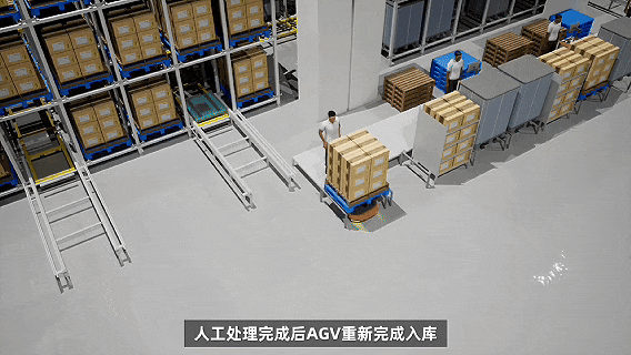在實(shí)施落地階段,團(tuán)隊(duì)嚴(yán)格遵循規(guī)劃方案,1:1還原仿真場(chǎng)景,實(shí)現(xiàn)客戶“所見即所得”的交付效果。庫(kù)區(qū)工作流程高度自動(dòng)化:貨物入庫(kù)時(shí)通過外形檢測(cè)、條碼掃描和稱重設(shè)備初篩,異常情況由AGV自動(dòng)轉(zhuǎn)運(yùn)至人工處理區(qū)修正;合格貨物由AGV對(duì)接四向車完成入庫(kù)。緩存支架區(qū)保障了物流銜接流暢,而人工區(qū)的異常處理、空托補(bǔ)充及尾托合托操作,均通過數(shù)字化提示系統(tǒng)與AGV聯(lián)動(dòng)形成閉環(huán),最終實(shí)現(xiàn)安全性與效率的雙重提升。