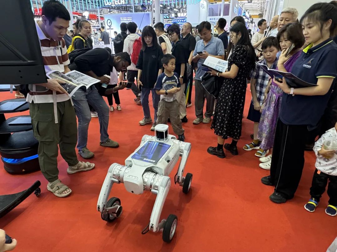 在本屆WRC上,“PUDU D5-W”也迎來(lái)了線下首秀。D5-W機(jī)器狗具備超強(qiáng)運(yùn)動(dòng)性能,可輕松適應(yīng)砂石、陡坡、臺(tái)階等復(fù)雜地形,并集成AI多模態(tài)交互、自主導(dǎo)航避障與多形態(tài)協(xié)作能力。展會(huì)現(xiàn)場(chǎng),D5-W機(jī)器狗在人群中靈活穿梭,并為觀眾提供智能引導(dǎo)服務(wù),其卓越的運(yùn)動(dòng)性能和協(xié)作潛力給觀眾留下了深刻印象。