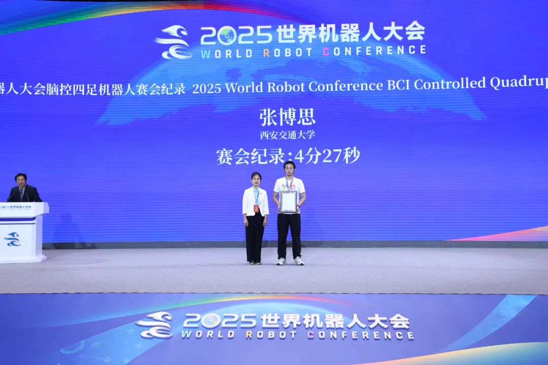2025世界機(jī)器人大會(huì)同期舉辦了BCI腦控機(jī)器人大賽,集中展示了腦控機(jī)器人領(lǐng)域創(chuàng)新技術(shù)應(yīng)用場(chǎng)景。經(jīng)過現(xiàn)場(chǎng)激烈比拼,誕生了2025年度腦控四足機(jī)器人賽會(huì)紀(jì)錄。來自西安交通大學(xué)的張博思用時(shí)4分27秒,成功使用腦控操控四足機(jī)器人完成8字形賽道及握手等任務(wù),達(dá)到正常手動(dòng)操作速率的85%,預(yù)示著腦機(jī)接口技術(shù)已具備在現(xiàn)實(shí)場(chǎng)景中完成復(fù)雜路徑與交互任務(wù)的能力。中國(guó)電子學(xué)會(huì)副秘書長(zhǎng)王天虹為紀(jì)錄創(chuàng)造者頒發(fā)證書。