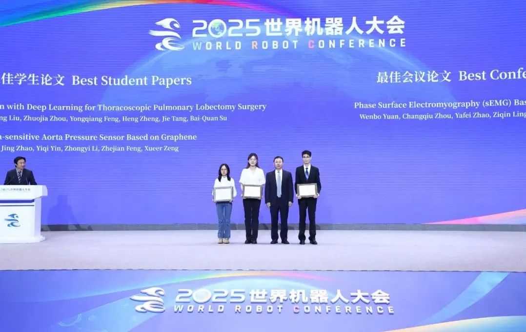 2025世界機(jī)器人大會(huì)“先進(jìn)機(jī)器人與自動(dòng)化國(guó)際學(xué)術(shù)會(huì)議”共收到來自中國(guó)、法國(guó)、美國(guó)、新加坡等10個(gè)國(guó)家的87篇論文。經(jīng)過前期盲審和現(xiàn)場(chǎng)答辯等嚴(yán)格評(píng)審流程,評(píng)選出“最佳學(xué)生論文”——《基于深度學(xué)習(xí)的內(nèi)窺鏡肺葉切除術(shù)手術(shù)階段檢測(cè)》《基于石墨烯的超靈敏主動(dòng)脈壓力傳感器》和“最佳會(huì)議論文”——《基于相位表面肌電信號(hào)(sEMG)的肌肉激活起始點(diǎn)檢測(cè)》。中國(guó)電子學(xué)會(huì)副理事長(zhǎng)兼秘書長(zhǎng)、總部黨委書記、世界機(jī)器人大會(huì)先進(jìn)機(jī)器人與自動(dòng)化學(xué)術(shù)會(huì)議主席陳英為“最佳學(xué)生論文”和“最佳會(huì)議論文”作者頒獎(jiǎng)。